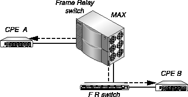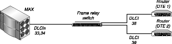 For example, consider the Frame Relay configuration in Figure 5-15. The MAX connects to two remote routers, DTE 1 and DTE 2, through the Frame Relay switch. The PVC to DTE 1 consists of DLCIs 34 and 38, while the PVC to DTE 2 consists of DLCIs 33 and 39.