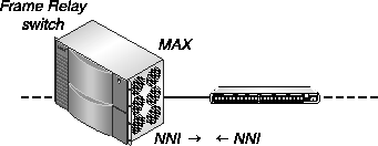 This example shows the MAX with both a UNI-DCE and an NNI interface. The UNI-DCE interface supports a Frame Relay link to a CPE (a user's workstation). Acting as a Frame Relay switch, the MAX has an NNI interface that supports a link to another Frame Relay switch. Figure 5-13 shows this configuration.