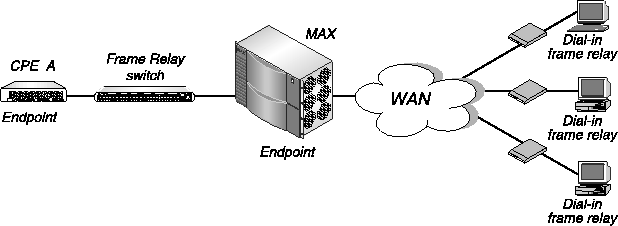 The user endpoint (DTE) sees the MAX as a Frame Relay switch (DCE). The MAX routes a gateway connection to the local network or out to another endpoint on the Frame Relay network.