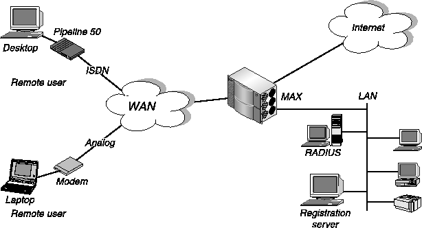 In Figure 1-4, the server provider has a RADIUS server and a separate registration server. When a new customer connects to the network using the name and password specified in the company's advertising, the MAX passes the request to the registration server. The server prompts the user to enter sign-up information.