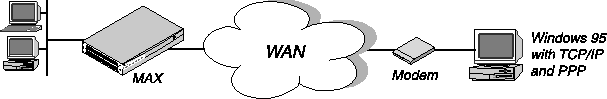 A modem call may contain PPP encapsulation. For example, if the user is running Windows 95 with the TCP/IP stack and Netscape, Windows 95 could be configured to dial up the MAX whenever Netscape is started. In that case, Windows 95 would be running async PPP. After the call is forwarded to the terminal server software, if PPP encapsulation is detected, the call is forwarded to the bridge/router software for an async PPP session.